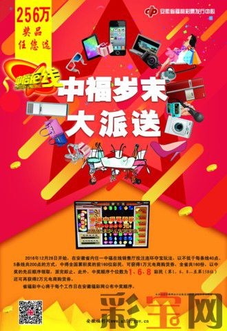 中福在线视频票自2009年在安徽省全面恢复销售以来,得到了广大爱心彩民的广泛支持与厚爱,为安徽省的公益福利事业做出了巨大的贡献。安徽省福彩中心值此辞旧迎新之际,为感谢广大彩民朋友对安徽中福在线视频票的支持,进一步回馈广大爱心彩民,决定于2016年末和2017年初开展“中福岁末大派送”营销活动,总奖品价值高达256万元。