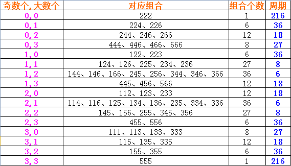 先来介绍一下组合个数的算法,这也是许多彩民比较难以理解的地方,也是计算周期、概率这些重要因素的基本数据。周期=216/符合该条件的组合数,中奖机会=1/周期。