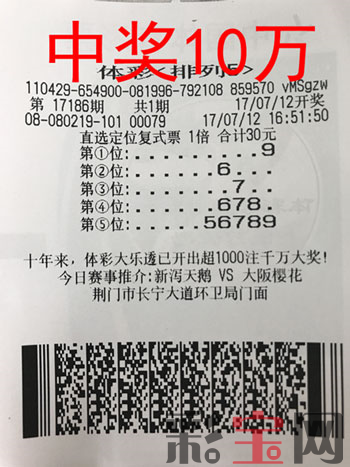 7月2日,第17186期体彩排列5开出中奖号码“96788”,当期全国中出20注,中奖站点位于湖北荆门市长宁大道的80219体彩销售点喜中排列5大奖1注,奖金10万元。