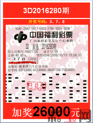 好运到了,起床就会遇着财神。晚上的3D2016280期开奖号码就是378,覃师傅单注投中。