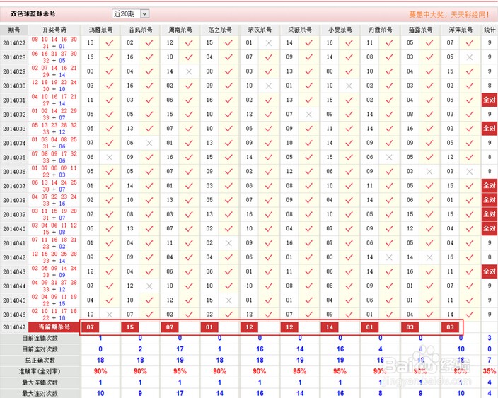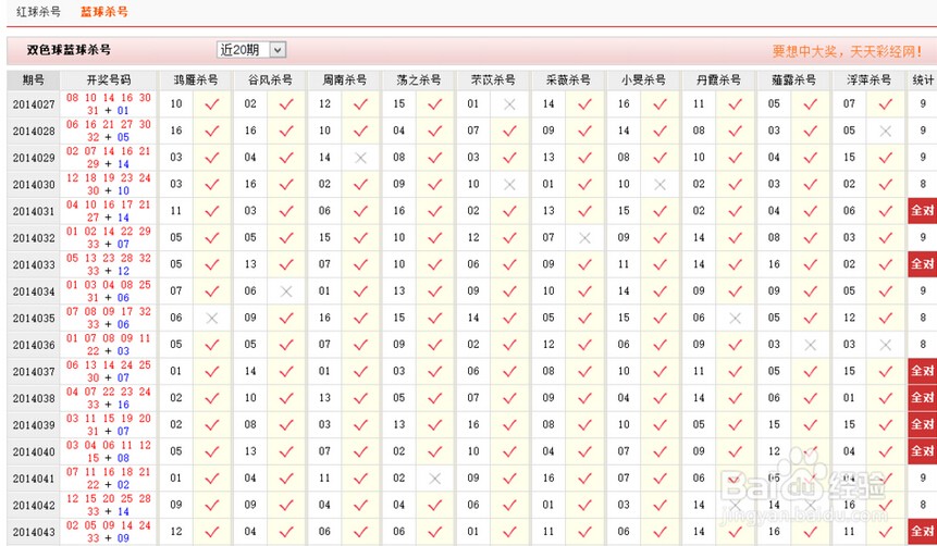 打开红球杀号与蓝球杀号,可以看到如下数据。通过图表我们可以看到系统提供的杀号数字正常确率还是很高的,在这里我们要记下加有红色背景的数字以便进入下一步的操作。