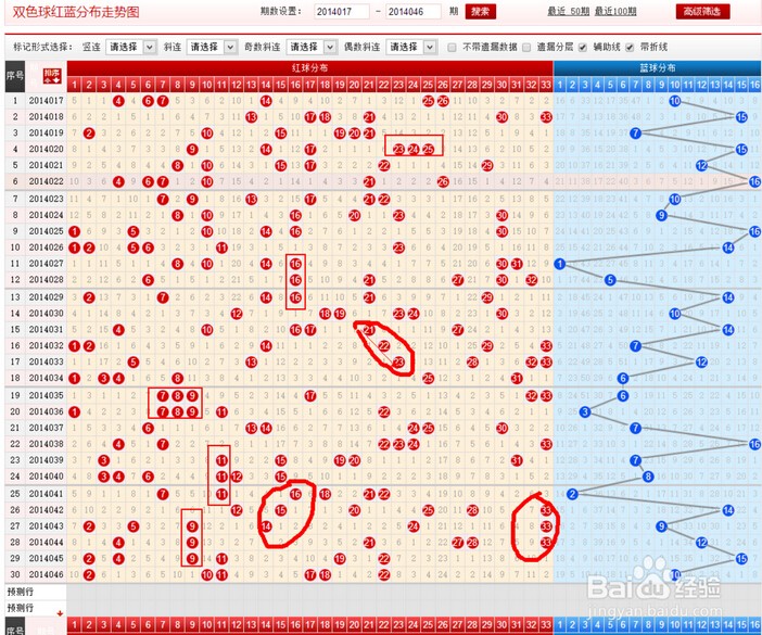 五、打开红蓝走势综合图,进行手动杀号,从下面右图我们可以总结出一个规律,即连续出现四个相连球的概率几乎为0.因此我如果出现连接3期连号(不论横的、竖的、斜的),下一期出现的号不会在同一条直线上。