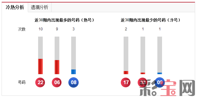 蓝球02已经遗漏9期,蓝球02同时近30期开出过3次,是近期热号之一。红球22为近期热号,无冷号。