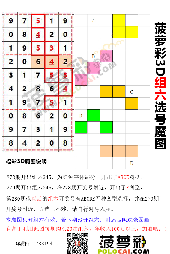 第242期或以后的组六开奖号有ABCDE五种图型选择,并在240期开奖号附近,五选三不难,请自行对号入座。 本魔图只对组六有效,若下期没开组六,则还是照这张图画