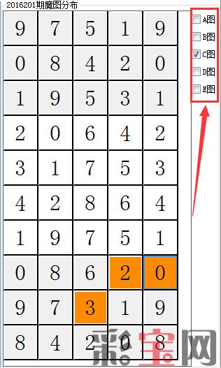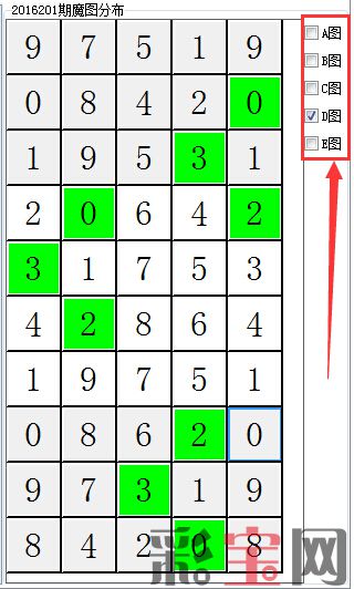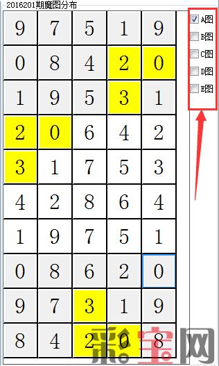 这种情况,我们可以打开菠萝彩数字三分析家软件,使用神秘魔图功能,在右侧可以对ABCDE复选框进行勾选,我们可以勾选A图形单独看它的分布情况: