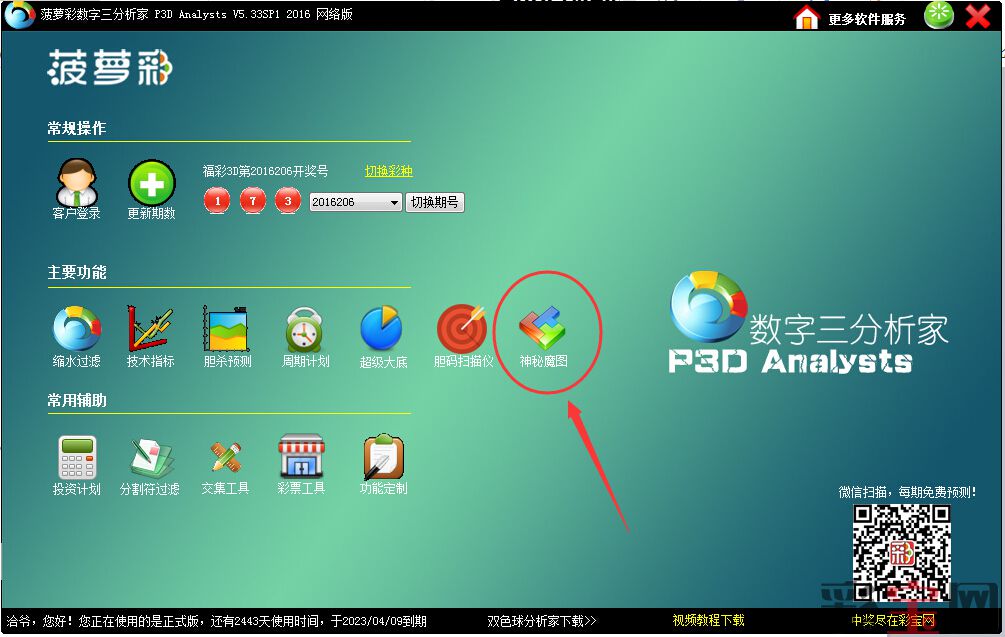 菠萝彩数字三分析家软件完全免费开放3D魔图的数据统计和应用,从下图位置点入即可: